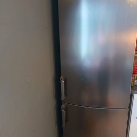 Noen merker på utsiden, men det vil ikke være synlig når det settes inn i skap. Den ene skuffen i fryseren har en sprekk.