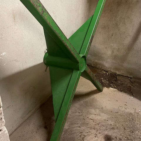 Grønn juletrærstativ laget av plast med metallfester for å holde treet stabilt. Designet for å gi støtte til juletrær i hjemmet.