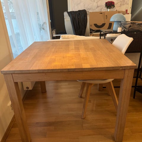 Bord i massiv eik (heltre), brukt som kjøkkenbord.