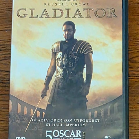 Universal Gladiator DVD med filmen Gladiator. DVD-en inneholder spesifikasjoner som lyd på flere språk, undertekster, og ekstramateriale. Formatet er standard DVD med bildeformat 16:9, og filmen har en spilletid på ca. 155 minutter.