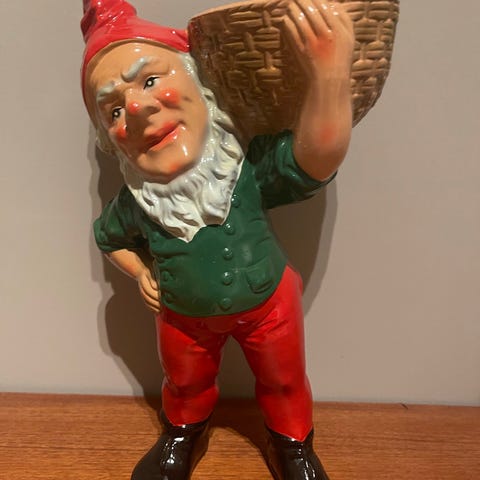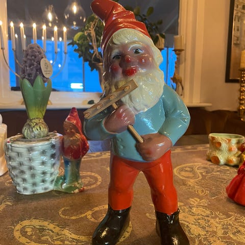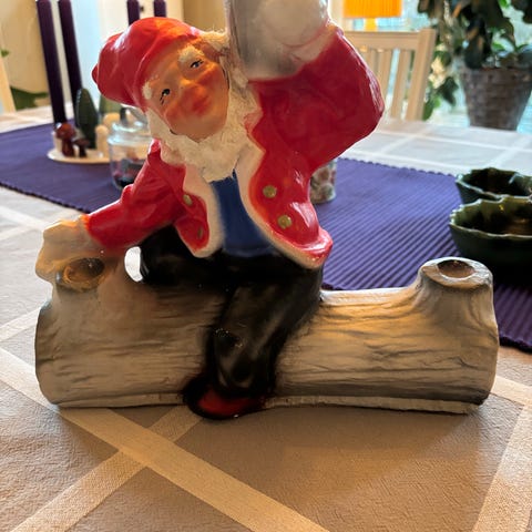 Gammel tysk nisse med lysholder i keramikk. Lite nag på ene øyebrynet