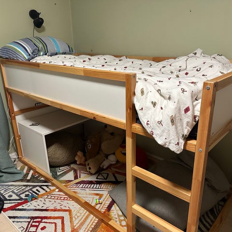 Fin og praktisk etasjeseng fra IKEA. Plass til skrivebord eller sofa under sengen. Ferdig demontert. Må hentes så snart som mulig!