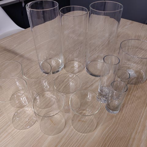 Selger 33stk glass vaser sylinder formet. Disse ble brukt i bryllup med båndene på som sitter lett på og kan tas av uten at det gjør noe med selve vasene.