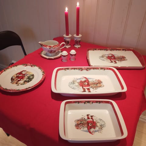 Classic av Anne Rooslien. Tallerkenene har røde kanter med gull ytterst, med julenissen motiv i midtpunkt. Hyggelig til juledekorasjon og koslig til servering i julehøytiden.