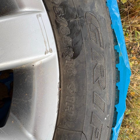 Originale VW sommerhjul med Goodyear dekk, ca 6mm mønster igjen. Felgene er noe kantkjørt og har litt korrosjon.