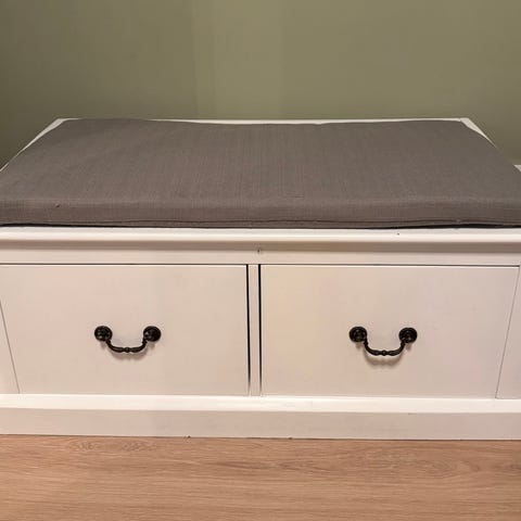 Fin sittebenk med oppbevaring til inngangen. Hvit med 3 kurver og pute.
