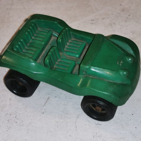 Selger en vintage grønn lekebil i plast, ca. 22,5 cm lang. Bilen fremstår i god stand, men høyre bakhjul sitter noe løst.