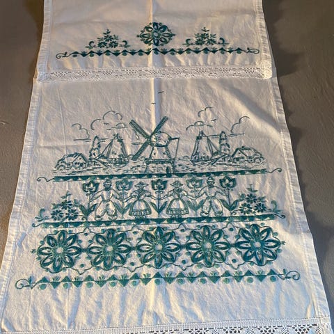 Til sammen fire deler som alle er hele, rene og pene. Den stripete har vært brukt, og blitt vasket noen ganger. De andre tre fremstår ubrukt, men var tiltenkt julegardiner. På -80/-90 tallet var det ofte detaljer av gull på julestoffer, det var «prikken over»…. !!