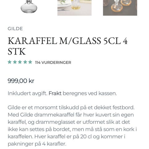 Produktinfo: Gilde er et morsomt tilskudd på et dekket festbord. Med Gilde drammekaraffel får hver kuvert sin egen karaffel, og drammeglasset er utformet slik at det ikke kan settes på bordet, men må stå som en kork i karaffelen. Hver karaffel er på 20 cl. Design: Inger Magnus.