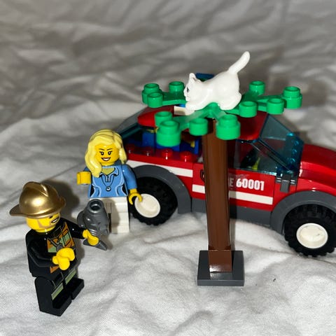 LEGO City 60001 Fire Chief Car sett med brannbil, to minifigurer, katt og et tre. Settet tilhører LEGO City-temaet og inneholder detaljer som brannbil med rødt og hvitt fargevalg, samt tilbehør for rollelek.