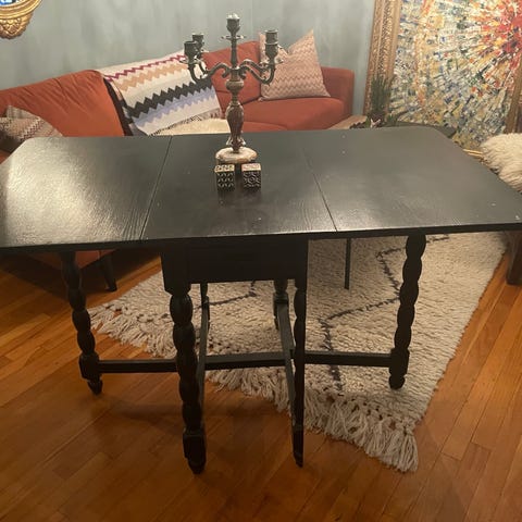 Flott klaffebord med lakkert overflate og malt understell i bonderødt. Solid og i god stand. Høyde 76 cm, bredde ca 75 cm, lengde med begge lemmer oppslått 146 cm og med lemmene nedslått 44 cm. Se bilder. Må hentes.