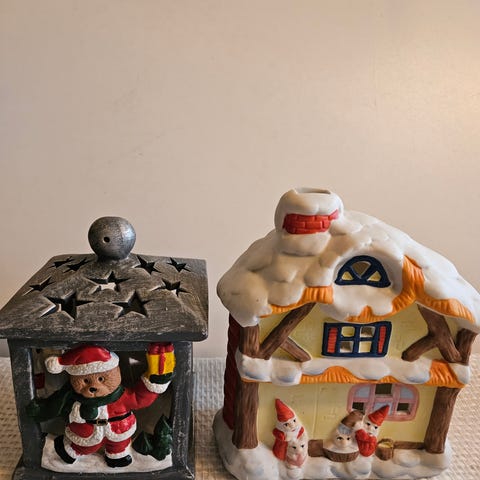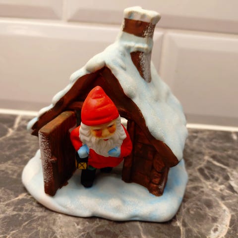 Sjeldent dekorativt, solid og velholdt, retro julenissehus i keramikk. For telys.