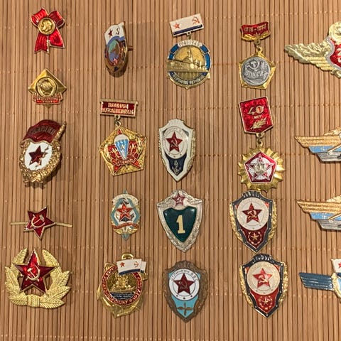 Div vintage Lenin vimpler jakkemerker luemerker og et lommeur. Klokken tikker og går.