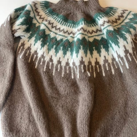 Nydelig genser selges. Strikket i alpakka fine. Lett, myk, varm og god. Litt stor M tenker jeg. Mål kan oppgis på forespørsel. Kan sendes mot frakt på kr. 73,-.