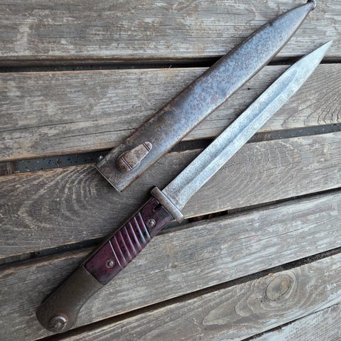 Mauser VZ 24 Bajonett selges. Laget i Tsjekkoslovakia under Tysk okkupasjon under andre verdskrigen. Stemplet Waa 80. Ikke slipt. Kun spor etter inn og ut av balgen. 2000kr+ evnt frakt.