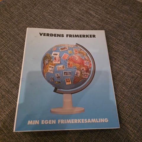 Selger et frimerkealbum som er fylt opp med frimerker fra hele verden.