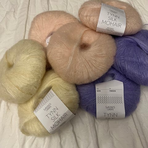 Sandnes Garn tynn silk mohair, 20 nøster. Litt lysere i fargen enn på bildet.