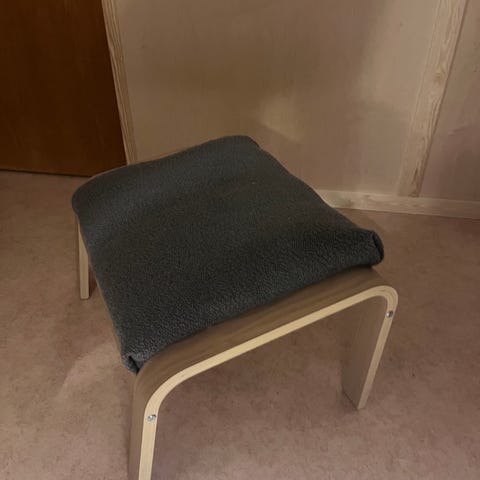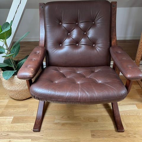 Poang lenestol fra IKEA med custom trekk i brunfarge faux skinn. Fotskammel i samme farge.