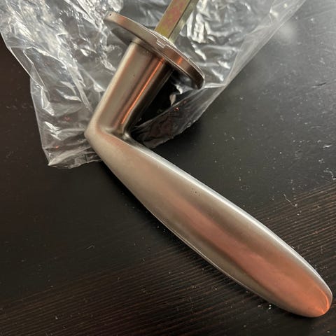 Dørhåndtak sett i rustfritt stål med rund rosett fra Assa. Passer for innerdører og har en moderne, rett design. Materialet gir god holdbarhet og motstand mot korrosjon. 4 stk vridere. 70kr per stykk eller 200 samlet.