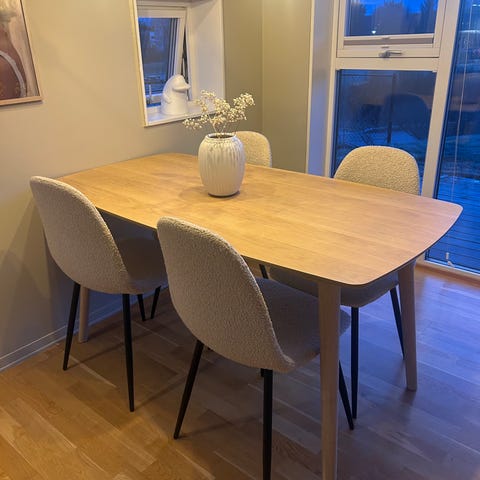 Fra Skeidar. Se detaljer og mål på bilder. Noe små bruksmerker, men langt fra sjenerende. Nypris 16200kr med di to tilleggsplatene. Må hentes. Tungt. Ca to år gammelt, skal byttes i et bredere da vi har stor plass til spisebord. På bildene er det kun en tilleggsplate på.