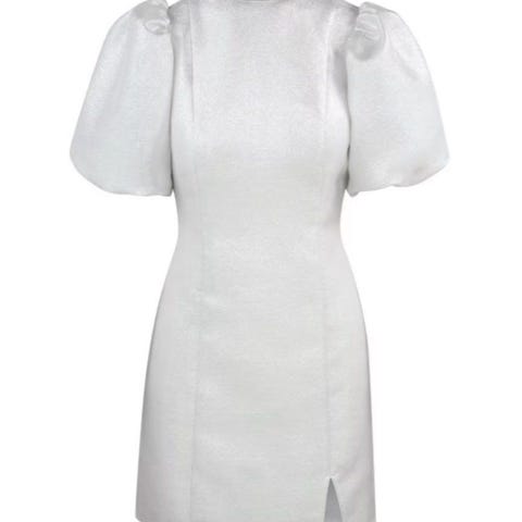 Elegant minikjole i lys farge med paljettdetaljer/bouclé-lignende struktur. Kjolen har rett passform, korte ermer og dekorative lommer foran. Perfekt til fest, middag eller andre anledninger der du vil pynte deg litt ekstra.