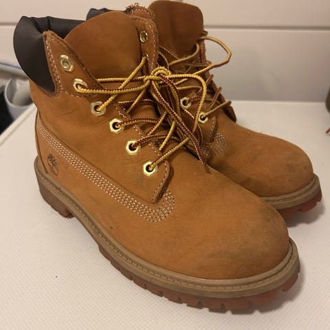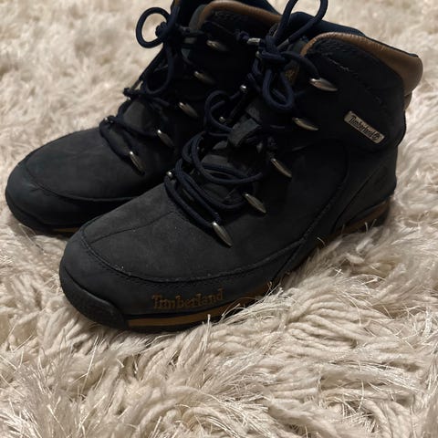 Timberland barn sko i størrelse 38, designet for gutter. Skoene er svarte og laget av slitesterkt materiale som egner seg for utendørs bruk.