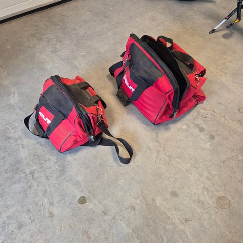 Hilti verktøysbag i rød og svart farge, laget av slitesterkt materiale. Bagen har flere lommer for oppbevaring av verktøy og tilbehør, justerbar skulderrem og bærehåndtak. Egnet for organisering og transport av ulike typer håndverktøy.