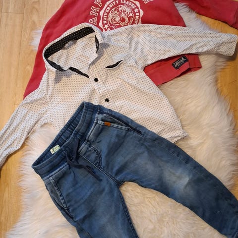 I størrelse 110/116 fra diverse merker. Inneholder også to ulltrøyer, men begge har noen småhull.