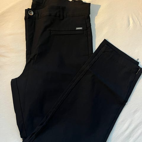 Bukse fra Dondup. Dressbukse-aktig, men i behagelig stretchy jearsey-stoff. Laget av viscose og polyamid, derav pustende stoff. Som ny utenpå, men the kremhvite stoffer inni er noe misfarger ref bilde. Størrelse 27, normal på størrelsen.