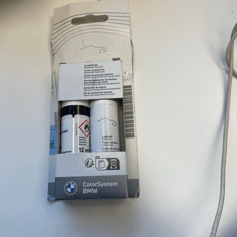 BMW ColorSystem Touch-up Stick i fargen 300 Alpinhvit. Produktet brukes til reparasjon av mindre lakkskader på bilens overflate for å opprettholde bilens utseende og beskytte mot rust. Leveres i en pakke med to enheter. Kjøpte direkte fra BMW og ble aldri brukt da bilen ble solgt.