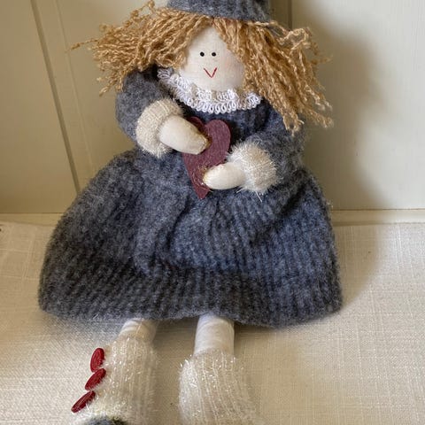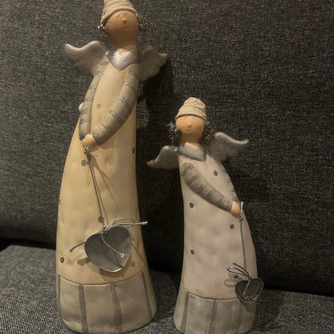 Julepynt - Engel i nisseklær og holder en due selges. Ca høyde; 36,5 cm. Må hentes, sender ikke.