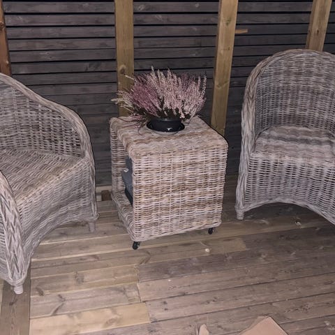 Utemøbelsett i hvit støpejern med bord og to stoler