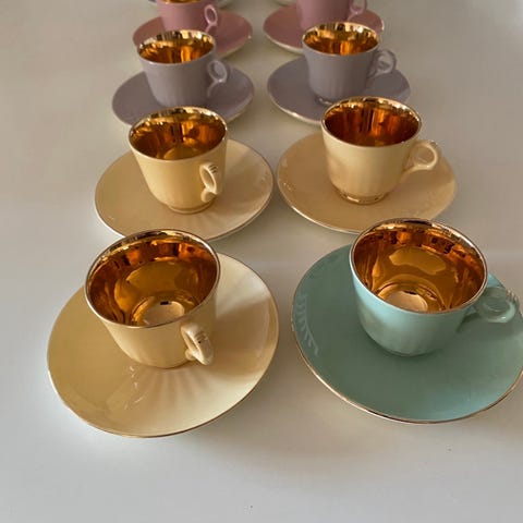 Sett med seks moccakopper med underskål fra Figgjo Fajanse. Rosa glasur med motiv av røde roser på koppen. Gullkanter på både kopp og skål.