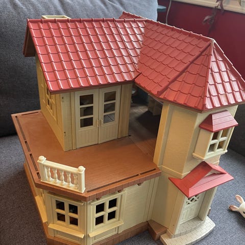 Pent brukt Sylvanian Families Dukkehus med flere rom, inkludert stue, kjøkken og balkong. Har lys i lampene. Piano. Trapp.
