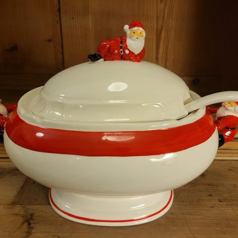 Selger et dypt fat/bolle og holder til smørpakke med julemotiver. Fargen er dyp rød. Pynter fint opp julebordet. De er laget i tre.