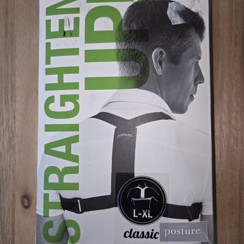 Svart holdningsvest/ryggstøtte som gir støtte til rygg og skuldre og bidrar til bedre holdning. Justerbare stropper for god passform og komfort. Pustende materiale på baksiden. Enkel å ta av og på, kan brukes under klær.