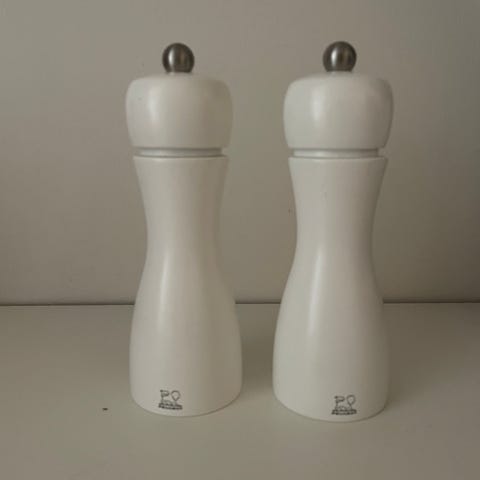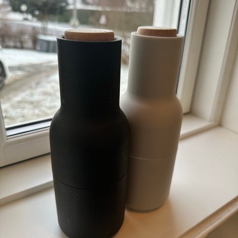 Salt og pepperkvern fra Audi Copenhagen. Saltkvernen er noe gulnet i fargen og pepper litt falmet. Fungerer fortsatt fint.