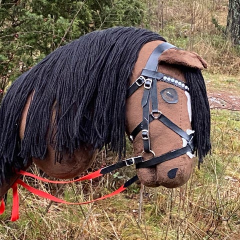 Lite brukt håndlaget kjepphest, med forskjellig utstyr som grime, leietau mm.