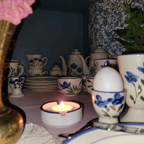 Blå mugge servise porselen lyseblå lysblå saus melk dessert interiør styling gammeldags gård antikk sausenebb jul fest middag vase