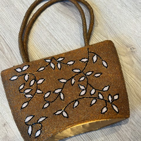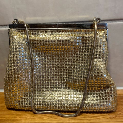 Beautiful rare gold party purse with handel in metal. Has rings and a golden chain inside so one can use it on the shoulder too. I guess made in the 80 s.