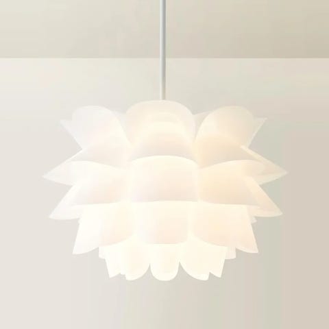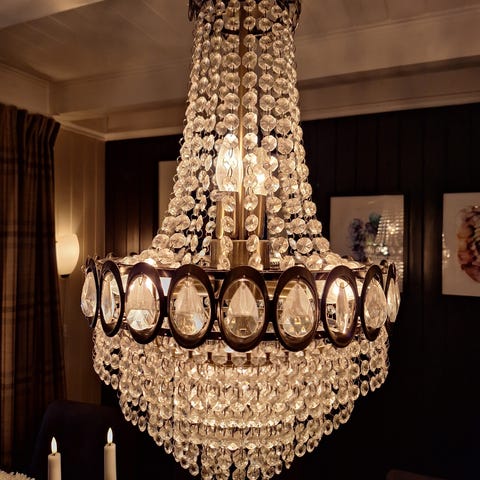 Hjemmelaga taklampe som er ca 150cm lang og 50 cm fra himling til underkant av treverket.