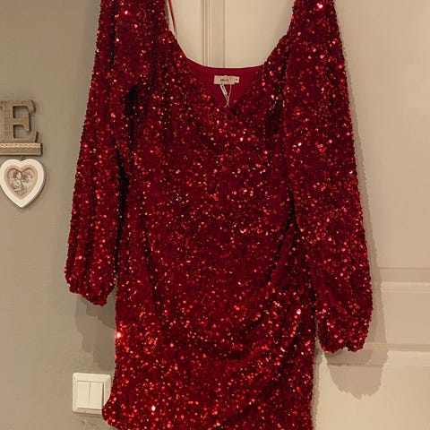 Nelly festkjole i størrelse M, farge rød, ubrukt/helt ny. Paljetter som gir et glitrende utseende.