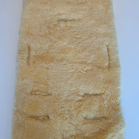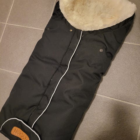 Blå Voksi vognpose, eldre modell. Yttertrekk bomull, innertrekk flanell. Ulldyne inni. Kan åpnes helt opp og brukes hele året.