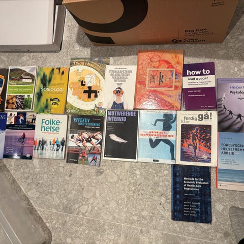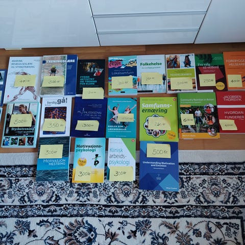 Selger pensumbøker brukt i helsefag-/idrettsstudier. Alle bøkene er minimalt brukt, uten markeringer eller notater, og fremstår som nesten nye.