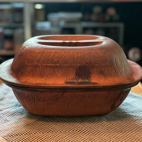 Selger én original tysk Schlemmertopf i terrakotta fra Schermack Kera.