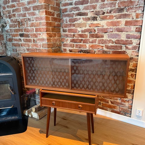 Selger hjørneskap og hyller i teak fra det jeg antar er Ergo De Luxe. Se nest siste bilde for hjørneskapet montert. Det kan monteres alene eller i kombinasjon med andre skap. Ben følger ikke med. Hjørnelist følger med.