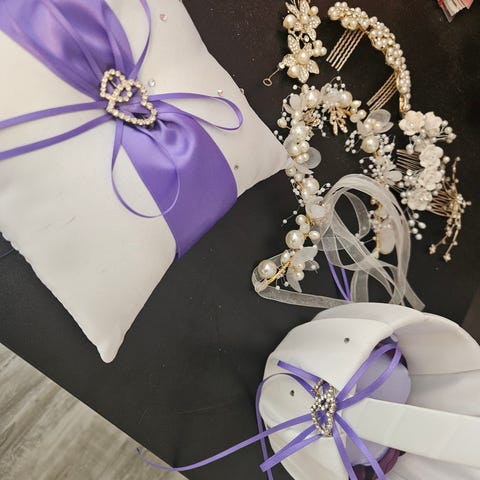 Tyll selges videre etter en gangs bruk i bryllup. Ble noen hull her og der i den ene lengden med tyll. Fire like lengder og to litt kortere lengder med tyll. Selges samlet for 500 kr