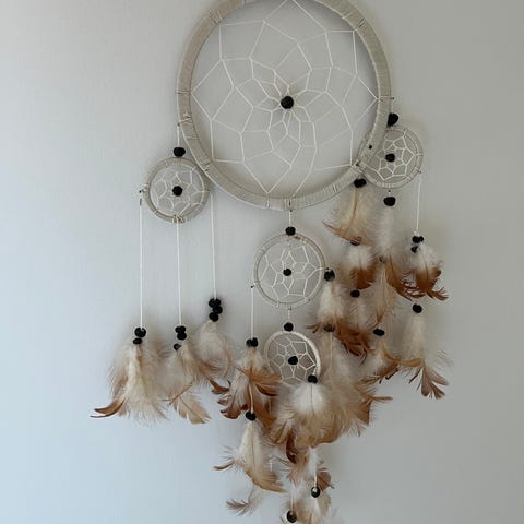 Med svarte ringer og brune å kvite fjør me svarte, kvit og brune små perle