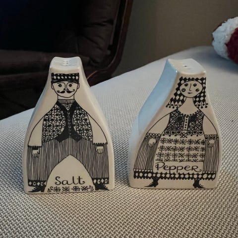 Figgjo salt- og pepperbøsser laget i keramikk med svart dekor på hvit bunn. Salt- og pepperbøssen har et hull i bunnen for påfylling. Designet som to figurer mann/salt og dame/pepper.