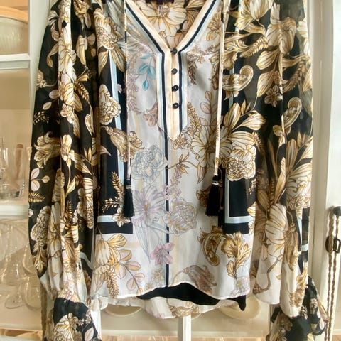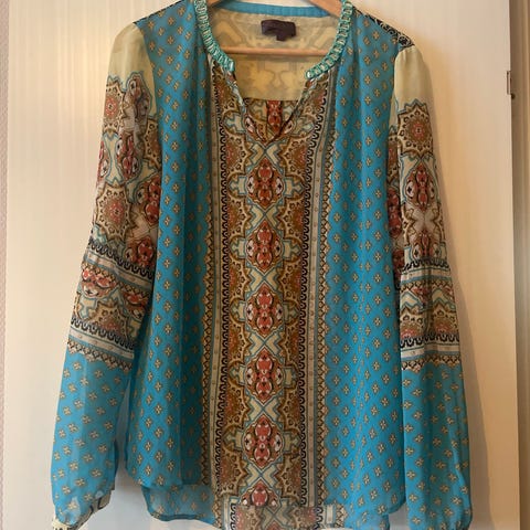 Hale Bob damebluse i størrelse L, flerfarget mønster, laget av bambusviskose(?). Blusen har lang erm og en lett, behagelig tekstur. Egnet for hverdagsbruk og kan kombineres med ulike antrekk.